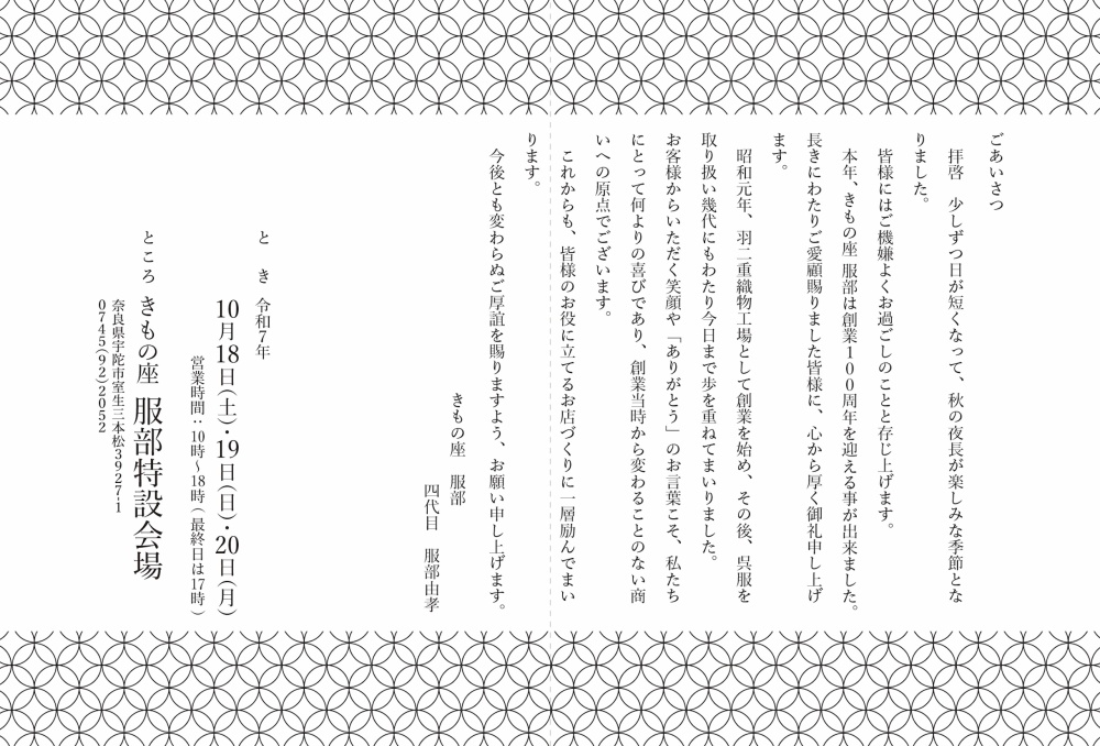 きもの座服部は、創業91年のきものひと筋の店。女人高野で親しまれている室生寺の地元です。四季を通じて豊かな自然に囲まれた当店へお気軽にお立ち寄り下さい。名物のお菓子で一服差し上げます。