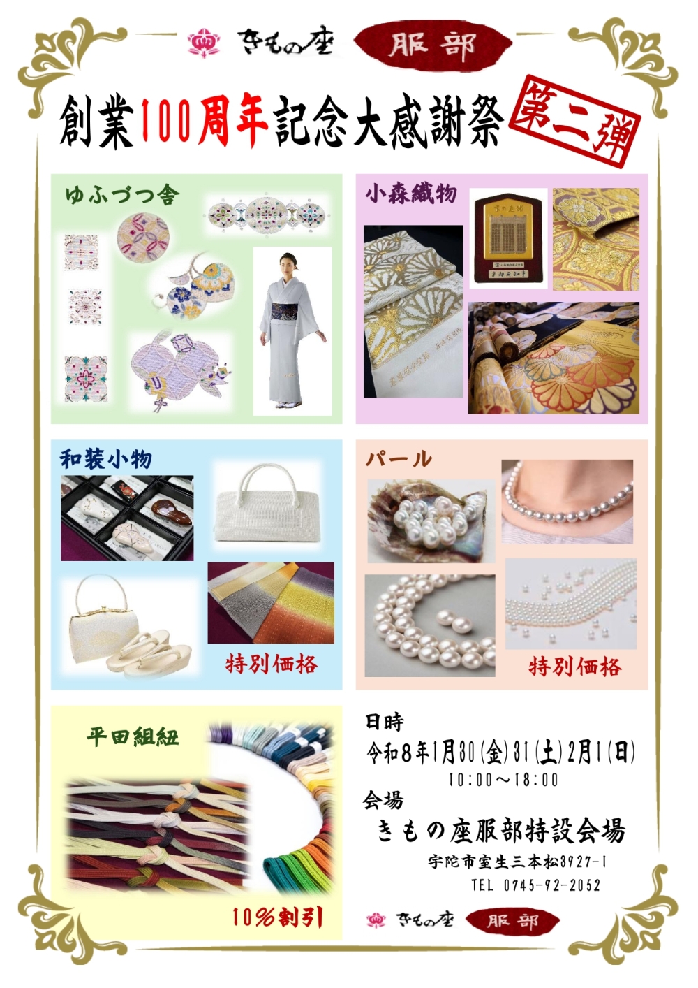 きもの座 服部は昭和元年から、室生のこの町できもの専門店として生まれ100年間、たくさんのお客様とご縁を頂き、創業100周年に魁て、平成29年11月に名張市桔梗が丘に振袖専門館TACHI 花を新規OPEN致しました。